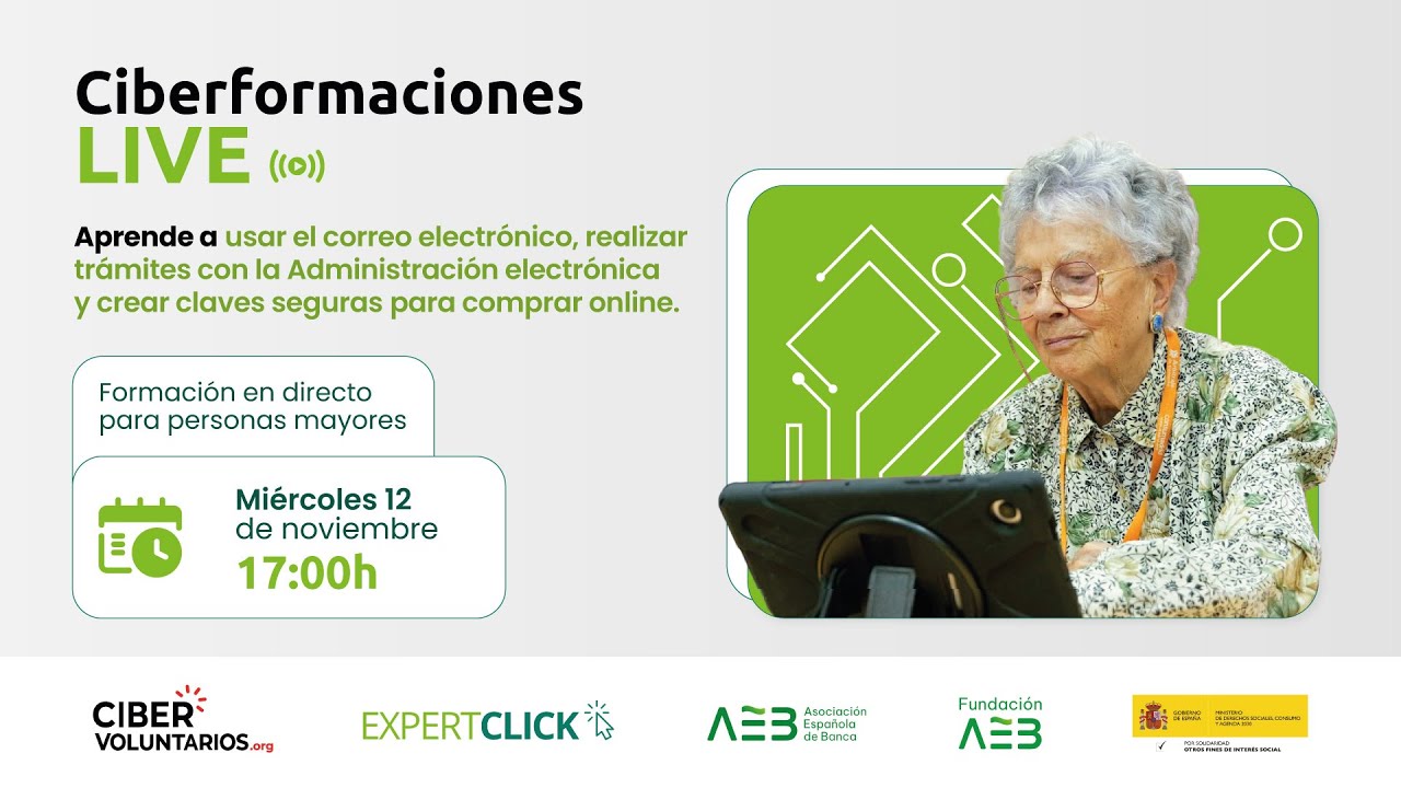 Expertclick ofrece formación en nuevas tecnologías a mayores de 55 años. En los cursos gratuitos presenciales y online, los mayores aprenden a navegar con seguridad y confianza por Internet y a utilizar su teléfono móvil o tablet para comunicarse por videoconferencia, hacer gestiones con su banco, pedir una cita médica, comprar online o aprovechar su tiempo de ocio creativo en la red. El objetivo es aumentar su independencia y autonomía personal a la hora de comunicarse, realizar trámites y participar de forma activa en la sociedad, mejorando así su autoestima y favoreciendo un envejecimiento activo y saludable. Expertclick es un programa realizado por Fundación Cibervoluntarios y la Fundación AEB de la Asociación Española de Banca (AEB), con el apoyo del Ministerio de Derechos Sociales, Consumo y Agenda 2030.